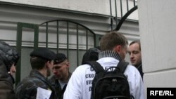 Зьміцер Хведарук: “Пры ўваходзе ў суд праверылі рэчы, адабралі некалькі хустак з надпісам “Малады Фронт”. Пасьля нейкі чалавек у цывільным забраў у мяне пашпарт, нецэнзурна вылаяўся і сказаў, што мяне яны не прапусьцяць”.