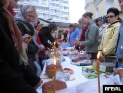 У менскай катэдральнай царкве шматлюдна было цягам усяе ночы, а таксама ўранку і днём. Людзі моляцца, ставяць сьвечкі, асьвячаюць велікодныя стравы. Многія ня здолелі патрапіць у будынак царквы і застаюцца на вуліцы. Гутару зь людзьмі: