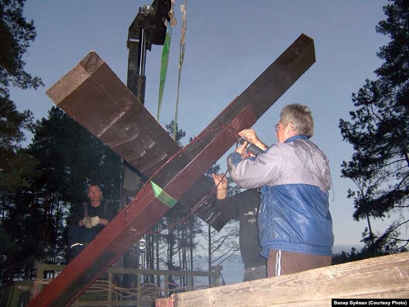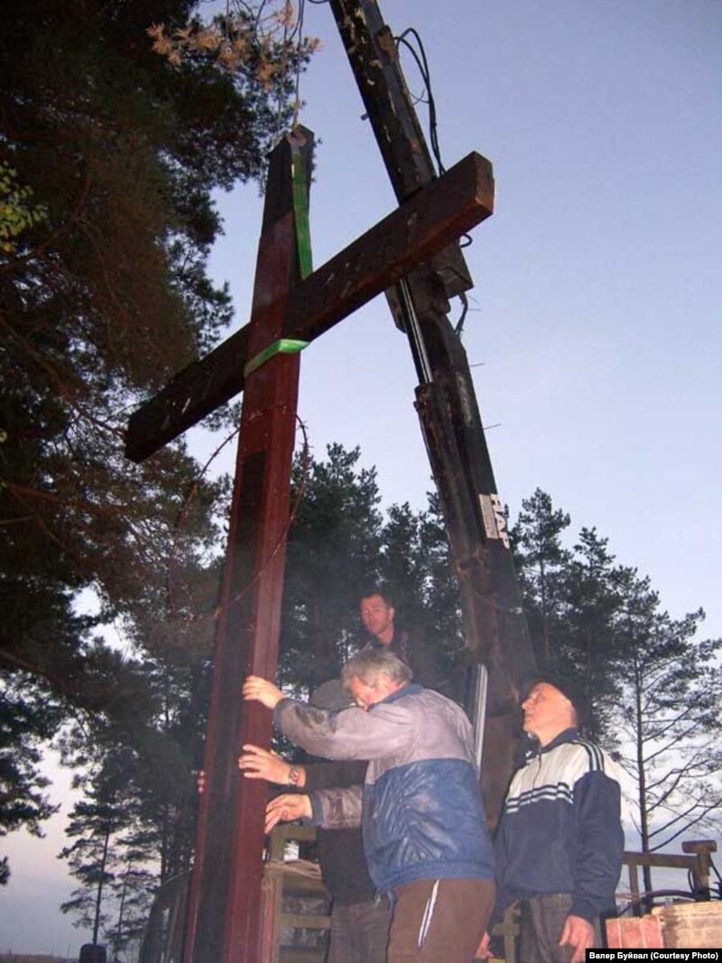 На фота – устанляваньне рэстаўраванага Крыжа Пакуты. На жаль, здымак кампазыцыйна загрувашчаны і з тэхнічнымі недахопамі. Але аўтар здымаў, як умеў, і фіксацыя падзеі тут ёсьць.