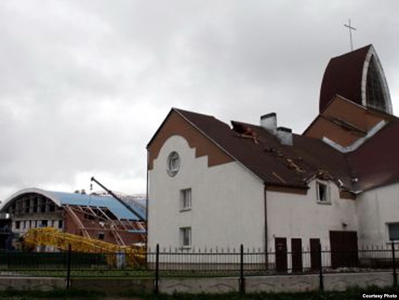 На храм абрынуўся вежавы кран, што задзейнічаны на будаўніцтве лёдавага палацу праз дарогу. У касьцёле разбураны дах, пашкоджаны пакой для прыёму гасьцей.