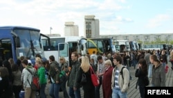 А 7-й вечара калёна зь дзесяці аўтобусаў са студэнтамі накіравалася ў Маскву. Бацькі, якія праводзілі сваіх дзяцей, крыху яшчэ затрымаліся, каб паразмаўляць. Паміж сабой яны абмяркоўвалі сытуацыю, калі з-за палітыкі дзяржавы беларускія грамадзяне вымушаныя ехаць у іншыя краіны па замежныя візы.
