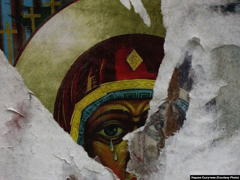 На фота 108 паказаны фрагмэнт зьнявечанага вандаламі абраза Багародзіцы ў Курапатах. Аўтар паслухаў парады, але крыху перастараўся. Фрагмэнт узяты занадта буйна. Трэба зьменшыць маштаб і папрацаваць над кампазыцыяй фрагмэнту. Павінны быць выяўленыя і вандалізм, і падтэкст новага сэнсу і выразнасьць кампазыцыі: усё гэта творчасьць, якая вымагае «пакутаў творчасьці».