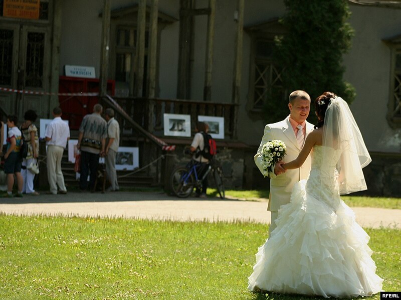 Краявіды з адпачывальніцамі ў старадаўніх сукенках аздаблялі шлюбныя строі некалькіх параў, якія сёньня абралі Лошыцкі парк за месца сваіх вясельляў.