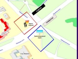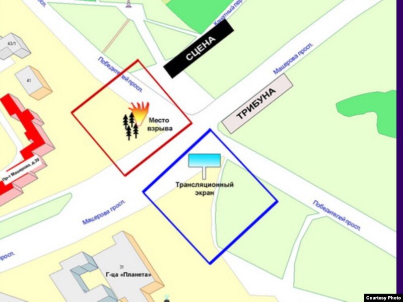 Падзеі адбываліся ў ноч з 3 на 4 ліпеня ў двух месцах. Месца, дзе адбыўся выбух, пазначана на схеме чырвоным колерам. А месца, дзе было знойдзена абясшкоджанае выбуховае прыстасаваньне — сінім колерам.