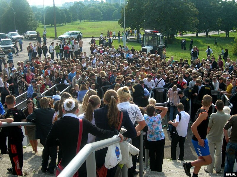Больш, чым за гадзіну да пачатку матчу на подступах да стадыёну “Трактар” стварыліся вялізныя заторы са школьнікаў ня толькі старэйшых клясаў, але і зусім малых дзяцей, якіх прыгналі на стадыён з заплечнікамі і торбамі са зьменным абуткам.