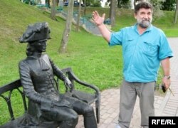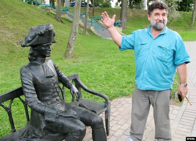 У чацьвер у Горадні зьявіўся новы помнік — малады мужчына ў вопратцы ХVІІІ стагодзьдзя сядзіць на вулічнай лаве.