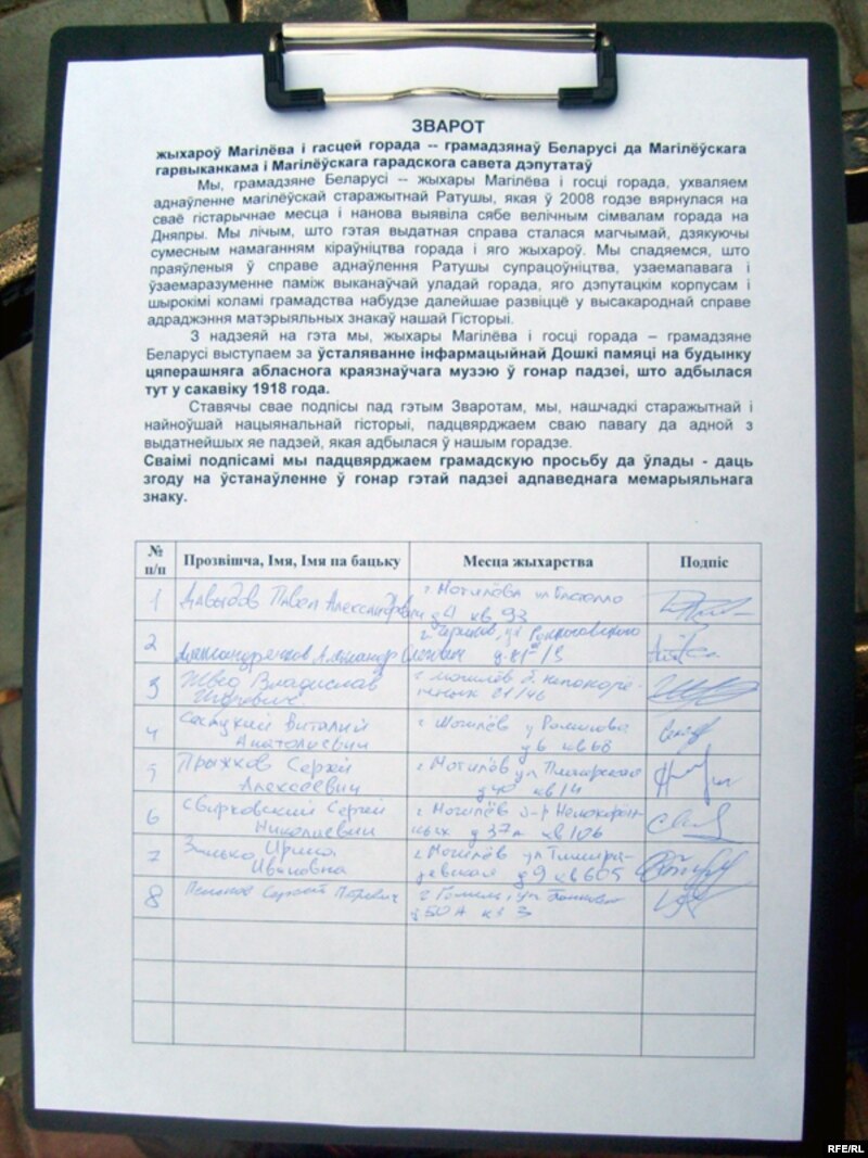 Актывісты незарэгістраванага руху “Маладая Беларусь” сёньня распачалі збор подпісаў за ўсталяваньне памятнага знаку на будынку, у якім 12 ліпеня 1918 году прадстаўнікі магілёўскай грамадзкасьці падтрымалі абвяшчэньне незалежнасьці Беларускай Народнай Рэспублікі. Цяпер у гэтым будынку месьціцца абласны краязнаўчы музэй, а ў 1918 годзе было гарадзкое казначэйства.