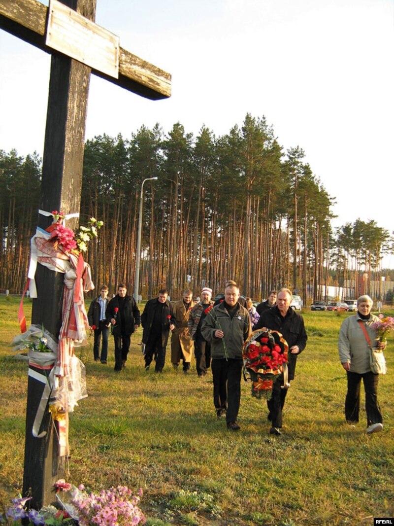 А 15 гадзіне да Пакутнага крыжа з надпісам: “Адно зь месцаў масавых расстрэлаў ахвяраў бальшавіцкай дыктатуры ў пэрыяд 1919—1940 г.г.” прыйшлі са сьвечкамі й восеньскімі кветкамі прадстаўнікі АГП, БНФ, стваранай Партыі свабоды й прагрэсу, руху “За свабоду” ды проста неабыякавыя гараджане.