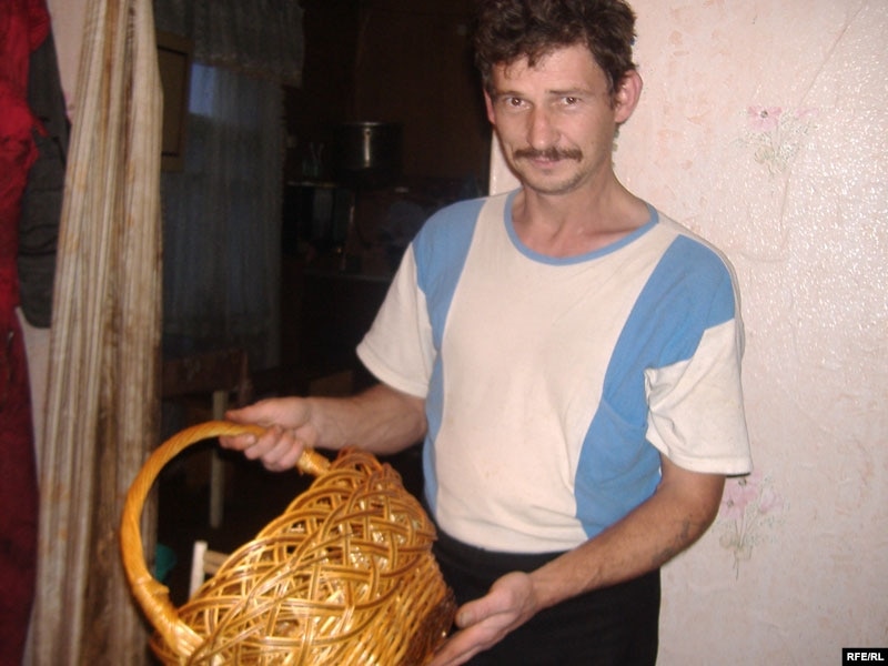 Але я ня зьехаў з Калодчына з пустымі рукамі. Тут жыве адзін з найлепшых майстроў лазапляценьня, Сяргей. Ягоная хата — своеасаблівы музэй прыкладнога мастацтва. Тут ёсьць з лазы і кошыкі, і крэслы, і дыванкі, і сталы, і нават афіцыянцкі столік на колцах.