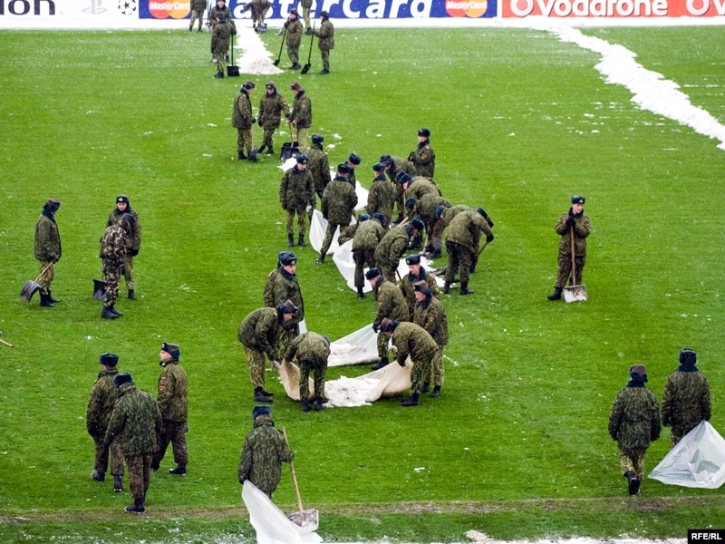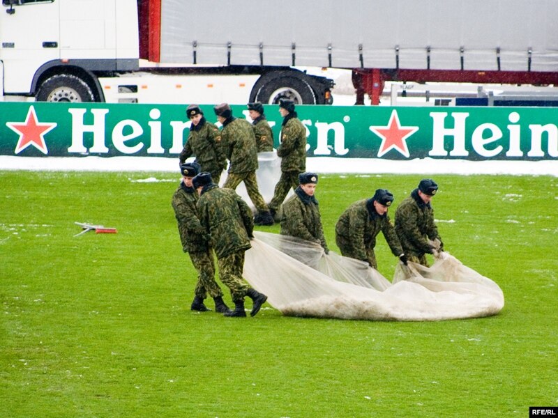 У той час, як малады настаўнік БАТЭ сустракаўся з журналістамі, сотні салдатаў тэрміновай службы намагаліся прывесьці да ладу засьнежаную арэну стадыёну “Дынама”. Адны шуфлямі зграбалі з поля сьнег, іншыя чысьцілі абледзянелыя трыбуны.
