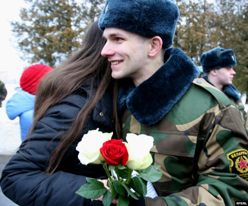 “Ставяцца вельмі добра. Людзі ў казарме распытваюць што ды як. Пытаюцца па-беларуску, бо большасьць людзей тут не зусім з Менску. Для іх няма праблемаў размаўляць па-беларуску. Вельмі добрыя сяржанты ў нас у вучэбнай роце былі.