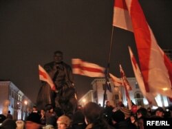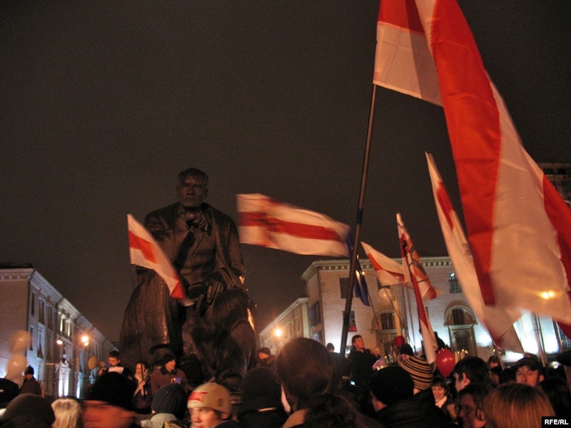 18:11 На плошчы прыкладна сто чалавек. Лёзунгі “Верам! Можам! Пераможам!” і “Жыве Беларусь!” Міліцыя працягвае папярэджваць, што акцыя несанкцыянаваная і заклікае разыходзіцца. Над плошчай — прыкладна 10 бел-чырвона-белых сьцягоў, сьцягі Эўразьвязу.