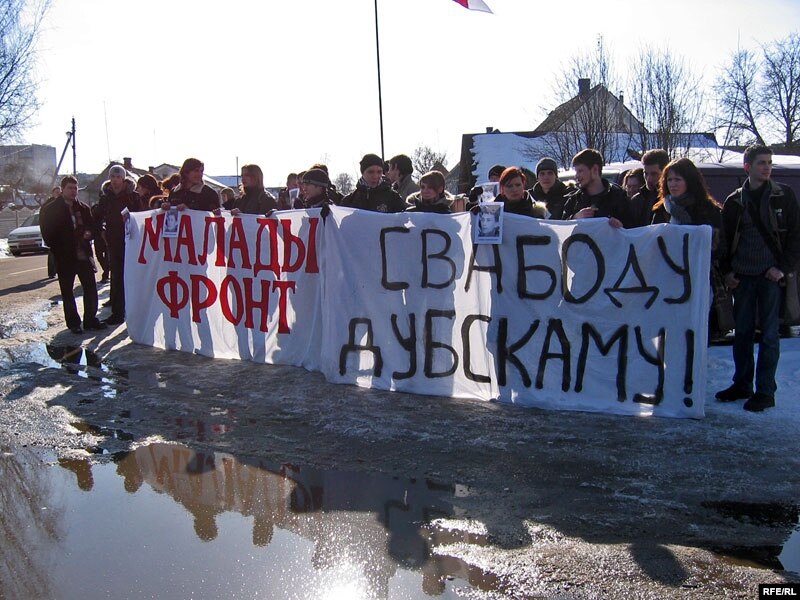 13:20 Каля будынку Асіповіцкай міліцыі сабраліся больш за 40 супрацоўнікаў міліцыі, сярод іх былі супрацоўнікі дэпартамэнту аховы з аўтаматамі. Яны сачылі за тым, каб моладзевыя актывісты не маглі прайсьці ў будынак, дзе знаходзіцца Арцём Дубскі. Маці Арцёма таксама не пусьцілі ў будынак, перад ёй зачынілі дзьверы. Да РАУСа таксама пад’ехала і вадамётная машына. Аднак маладзёны разгарнулі расьцяжку “Свабоду Арцёму Дубскаму!” і бел-чырвона-белы сьцяг і трымаюць ягоныя партрэты. Яны скандуюць “Жыве Беларусь!”, “Свабоду Дубскаму!”