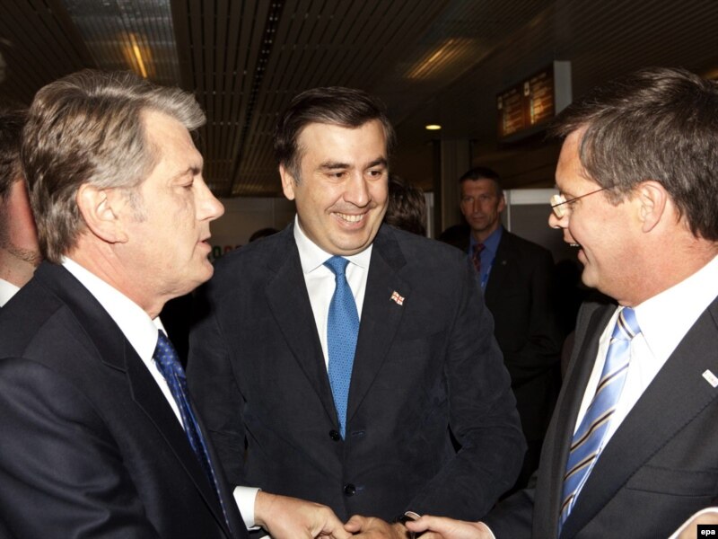Прэзыдэнт Украіны Віктар Юшчанка, прэзыдэнт Грузіі Міхаіл Саакашвілі і прэм'ер-міністар Нідэрляндаў Ян-Пэтэр Балкенэндэ (зьлева направа)