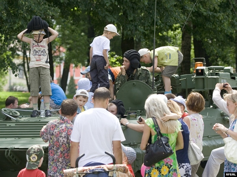 …а дзятва пасьпявала пагуляцца ў вайну і прымерыць сапраўдны танкісцкі шлем.