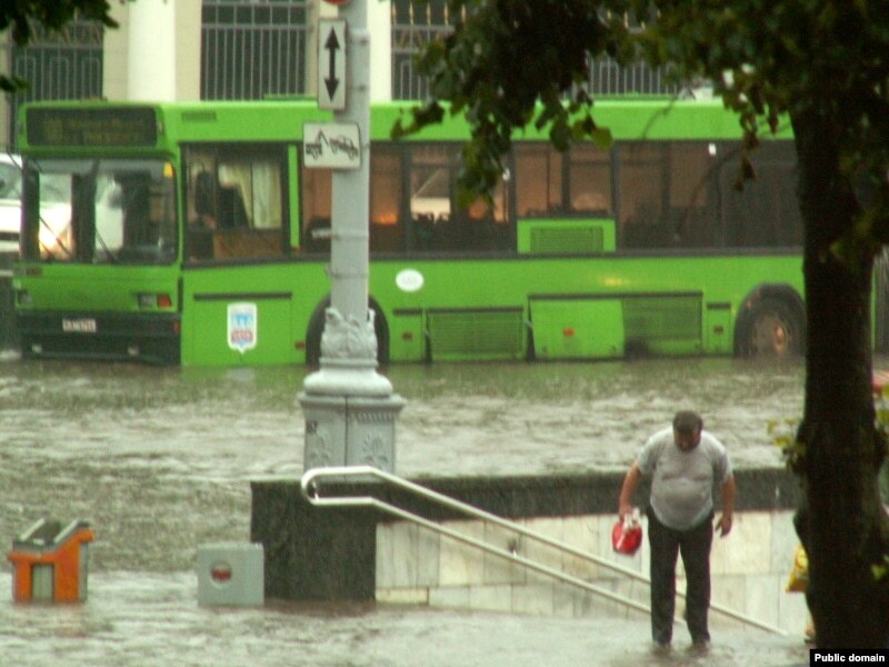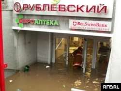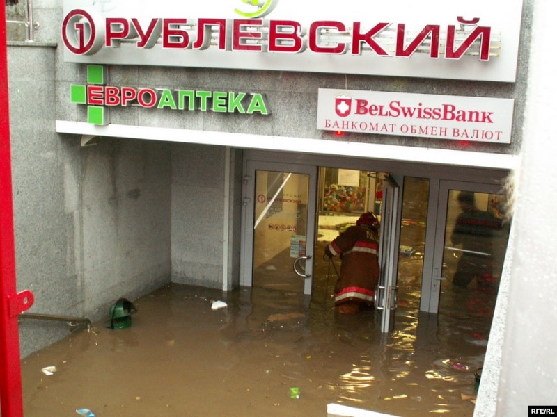 14.55 У Менску пачалася залева. Празь некалькі хвілінаў вада заліла праспэкт Незалежнасьці. На вуліцах утварыліся заторы.