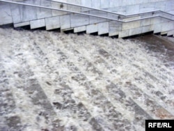 Па лесьвіцы ў мэтро спусьціцца стала немагчыма, бо вада лілася як з брандсбойту.