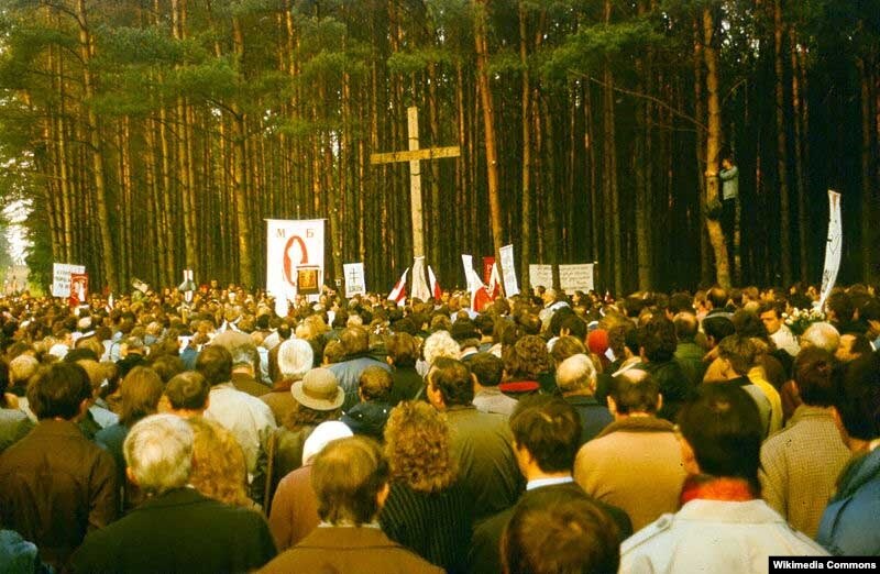У Курапатах гучэў Рэквіем. Пад гукі Рэквіему паднялі і паставілі Крыж. Дзясяткі людзей кінуліся дапамагаць, кожны хацеў дакрануцца да яго рукой. Потым сьвятары ўсіх чатырох хрысьціянскіх канфэсіяў, па чарзе, асьвяцілі Крыж. Ад каталікоў – ксёндз Уладзіслаў Завальнюк, ад пратэстантаў – пастар Эрнэст Сабіла.... Вуніяцкія дзяўчаты зь белымі кветкамі пад камандай ксяндза Яна Матусевіча сьпявалі беларускія Псальмы. А з праваслаўнага сабору ў Менску прыехала цэлая каманда зь пяці ці шасьці духоўных асобаў і адслужылі цэлую службу з кадзілам і песьнясьпевамі.