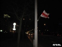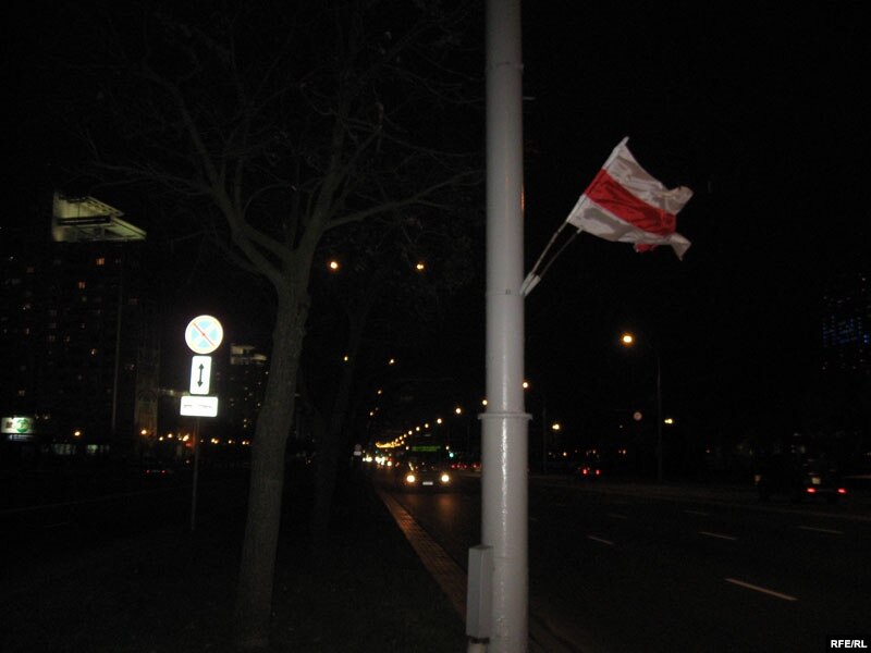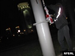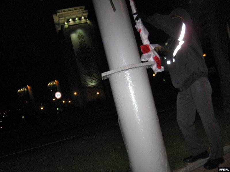 Калі міліцыянты пачалі здымаць сьцягі, падсаджваючы адзін аднаго, кіроўцы аўтамабіляў ім сыгналілі. Некалькі маладых людзей праз адчыненыя вокны аўтамабіля пачалі сьвістаць.