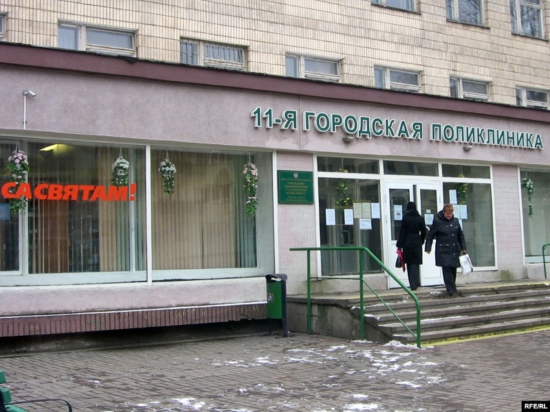 11-я гарадзкая паліклініка пры ўваходзе віншуе пацыентаў «са сьвятам».