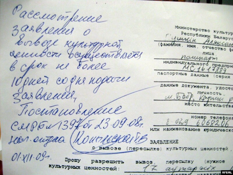 Паводле закону Міністэрства культуры дае дазвол на вываз за мяжу культурных каштоўнасьцяў, у тым ліку малюнкаў, якія належаць іх аўтарам. Мастак Алесь Пушкін афіцыйна зьвярнуўся па такі дазвол у Міністэрства культуры Беларусі. Мастак прасіў дазволу на часовы вываз 17 сваіх малюнкаў, адабраных спэцыялістамі музэю сучаснага мастацтва гораду Кальмар у Швэцыі. Выстава мае адчыніцца 4 сьнежня. Сёньня, 1-га сьнежня, аўтар плянаваў выправіцца за мяжу разам з малюнкамі. Заяўку разглядала загадчыца аддзелу міністэрства Таісія Капыльская.