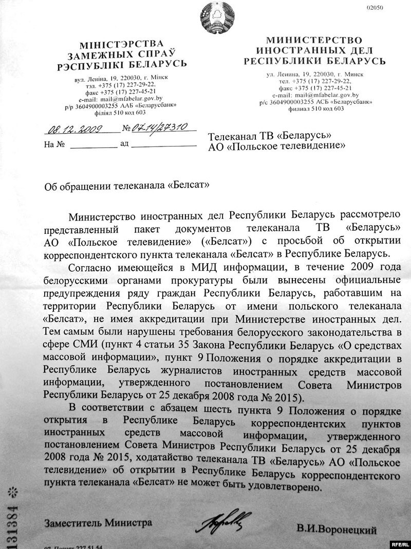 Паводле спадара Янчука, ліст з адмова падпісаны намесьнікам міністра замежных спраў Беларусі Валерам Варанецкім. Падстава для адмовы тая, што паводле пракуратуры цягам году журналісты Белсату працавалі на тэрыторыі краіны без акрэдытацыі, чым парушылі закон.
