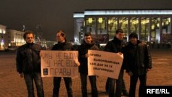 Шасьцёра хлопцаў выйшлі на плошчу з плякатамі «Мы — ня быдла, у нас ёсьць правы!», а таксама «Правы грамадзян выконваюцца там, дзе за іх змагаюцца».