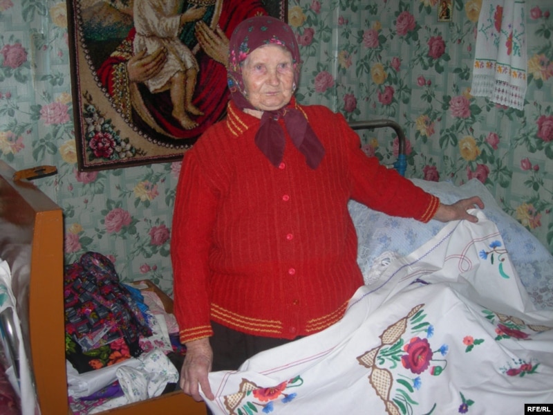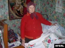 Ксенія: «Яшчэ і тутачкі. Як прыехала, вось такія ткала. І вышывала. А я адна ж у хаце. Ведаеце, сумна. Гарыць сьвятло. Саджуся і вышываю».