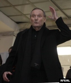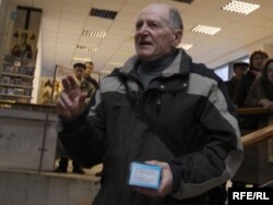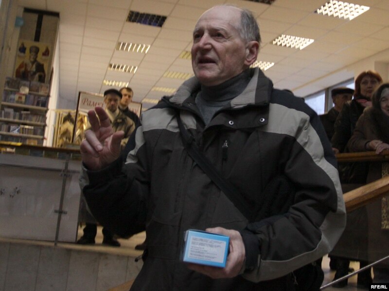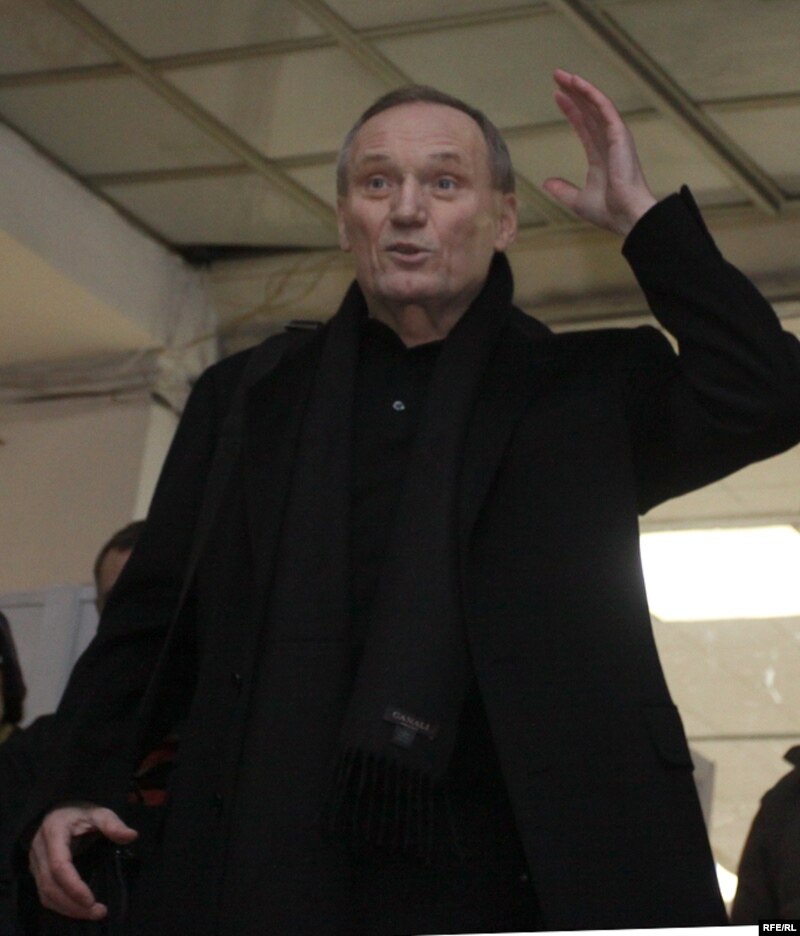 А затым на прыступках зьявіўся паэт Уладзімер Някляеў, які меўся быць вядоўцам вечарыны.