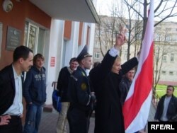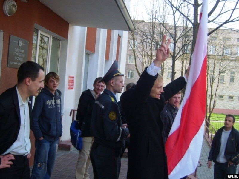 Сяргей Каваленка, падыходзячы да судовага будынка, нечакана для ўсіх дастаў ды разгарнуў бел-чырвона-белы сьцяг і ўзышоў зь ім на ганак. Прысутныя адгукнуліся на ягоны вокліч «Жыве Беларусь!», а дзяжурны міліцыянт пачаў сьпешна выклікаць падмацаваньне. Неўзабаве каля суду зьявілася адразу некалькі службовых машын, зь якіх павыходзілі міліцыянты і людзі ў цывільным.