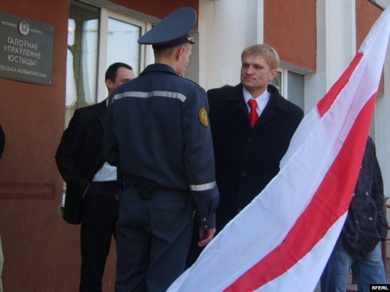 Сяргею Каваленку загадалі згарнуць сьцяг, але ён не пагадзіўся і павесіў яго перад уваходам у суд. Міліцыянты сарвалі нацыянальны сымбаль, і тады Сяргей Каваленка зноў яго ўзьняў: