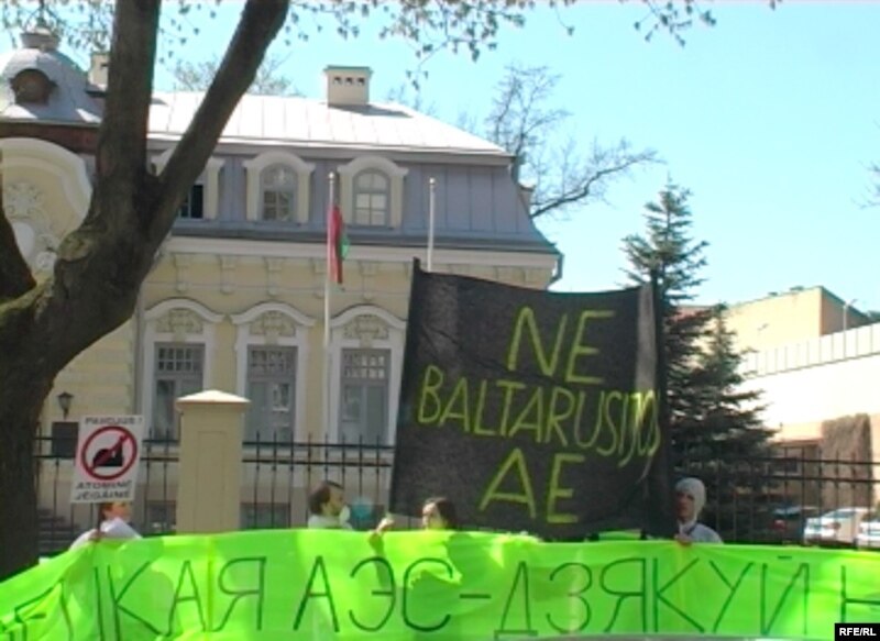 Удзельнікі акцыі каля будынку амбасады Беларусі ў Літве трымалі расьцяжкі і плякаты з надпісамі па-літоўску і па-беларуску «Не-- беларускай атамнай», «Астравецкая АЭС — дзякуй, не трэба!»