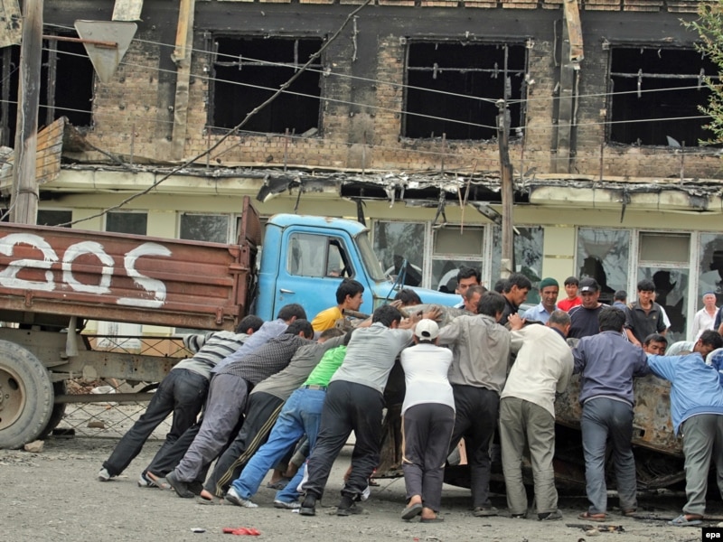 Наш карэспандэнт Брус Панье, які сочыць за падзеямі ў Ошы, апісвае сцэны разбурэньняў, згарэлых дамоў з выбітымі вокнамі. Паводле яго, у некаторых раёнах гораду назіраецца сыстэматычнае зьнішчэньне маёмасьці ўзьбекаў.