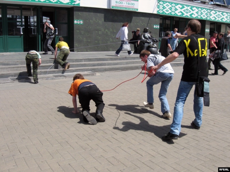 Маладыя людзі, да якіх былі прывязаныя ланцугі, поўзалі на карачках, нібы сабакі, а хлопец у камізэльцы не даваў ім разьбягацца і ўвесь час цягнуў за ланцужкі. Удзельнікі флэшмобу пад рогат мінакоў дайшлі такім чынам да ганку Камароўскага рынку, і на гэтым акцыя завяршылася.
