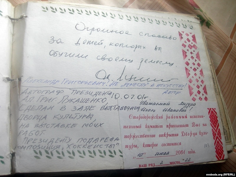 Ігар: «Ну, напісаў, як яны мяне інструктавалі — стой, рукі па швах. А, во, Лукашэнка размашыста. Яму сказалі, што дзяцей я вучыў. „Спасіба, што дзяцей рэмеслу навучылі“. Як бы ў прэзыдэнта аўтограф узяць у сваю кнігу водгукаў? Яны ў мяне ўбяруць гэту кнігу, а я зноў. І так тры разы. У рэшце рэшт я аўтограф гэты ўзяў».