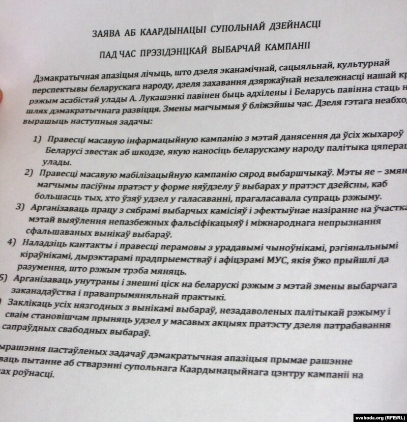Заява аб каардынацыі супольнай дзейнасьці ўтрымлівае шэсьць пунктаў, у тым ліку — інфармацыйную працу з насельніцтвам і наладжваньне перамоваў з прадстаўнікамі ўлады, назіраньне за хадою галасаваньня на выбарчых участках у дзень выбараў, арганізацыю і правядзеньне масавых акцый пратэсту ў выпадку фальшаваньня вынікаў выбараў.