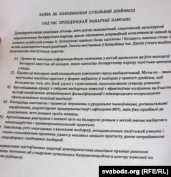 Прадстаўнікі шэрагу апазыцыйных палітычных партый і рухаў падпісалі заяву аб каардынацыі супольнай дзейнасьці падчас прэзыдэнцкай выбарчай кампаніі. Некаторыя лідэры пагадненьне падпісалі часткова альбо цалкам адмовіліся ад падпісаньня.