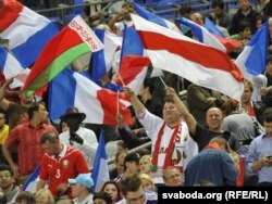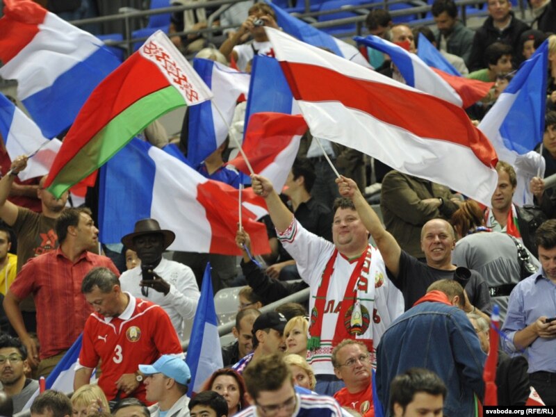 Беларускія фанаты на арэне «Стад дэ Франс». Іхняе «Верым, можам, пераможам» часам было чуваць нават на супрацьлеглай трыбуне.