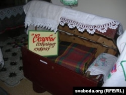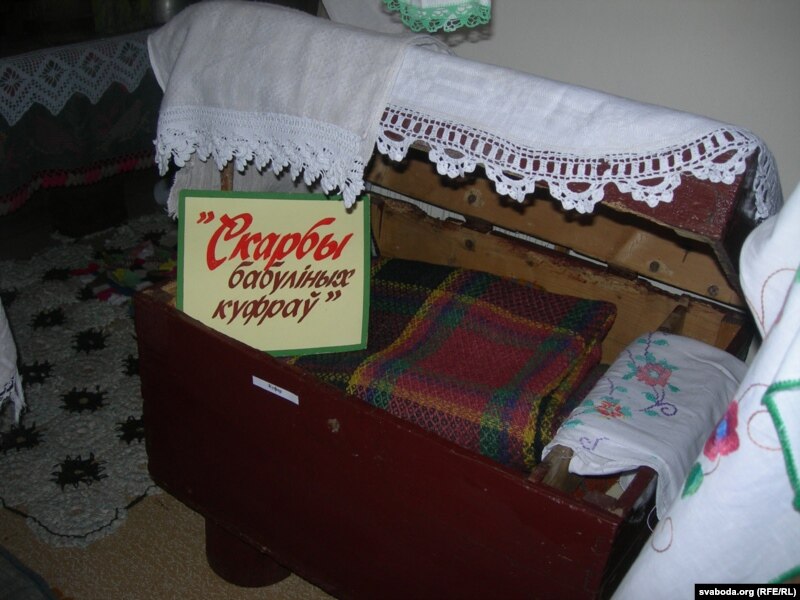Марыя: «Даўней гэтыя боцікі ня кожны мог абуць. Гэта лічылася шыкоўная вопратка. Ды хромавыя. Гэта ж чыстая скура! А баба была багатырка, гэтая жанчынка. А вось калыска, якой семдзесят гадоў. А яшчэ ў мяне ікона. Маёй сьвякроўкі маці ішла замуж з гэтай іконай і з гэтым ручніком. Ну і куфар. У куфры ў мяне многа багацьця. У краме такога ня купіш. Такія посьцілкі прыгожыя.»