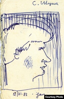 У Зоські Верас у “лясной хатцы”. Вільня, лета 1983 году. Стаяць Лявон Луцкевіч, Пётра Садоўскі, Сяргей Шупа і Сяргей Мурашка. Сядзяць Тацяна Сапач і Зоська Верас.