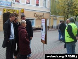 Спадар: «Хачу сказаць, што людзі цікавяцца выбарамі, падыходзяць да стэнду, чытаюць, але бачу, што пакуль яны ня вызначыліся, дый большасьць зь іх ня маюць пашпартоў — гэта яшчэ толькі пачатак збору подпісаў».