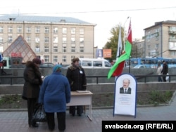 Па-над пікетам вылучэнца на прэзыдэнцтва ад партыі БНФ Рыгора Кастусёва лунае бел-чырвона-белы сьцяг. На стэндзе — біяграфія прэтэндэнта на тарашкевіцы. У фронтаўскага актывіста Віталя Макаранкі пытаюся, на якой мове ён гаворыць з падпісантамі: