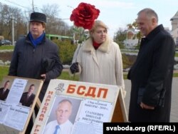 Побач з фронтаўскім пікетам — пікет ініцыятыўнай групы Ўладзімера Някляева. Плякаты беларускамоўныя. Падпісныя лісты — па-беларуску. Ігар Барысаў запаўняе іх таксама па-беларуску: