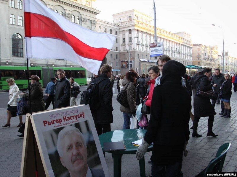 Нацыянальныя сьцягі на пікетах па зборы подпісаў выкарыстоўваюць ініцыятыўныя групы Рыгора Кастусёва. Адзін з такіх пікетаў якраз прайшоў у мінулыя выходныя ў Воршы, распавядае мясцовы актывіст кампаніі «Праваабаронцы за свабодныя выбары» Ігар Казьмярчак: