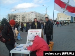 Побач спадарыня Галіна зьбірае подпісы за Андрэя Саньнікава. Звычайна ля пікету за Саньнікава вісіць сіні штандар Эўразьвязу, але сёньня яго няма.