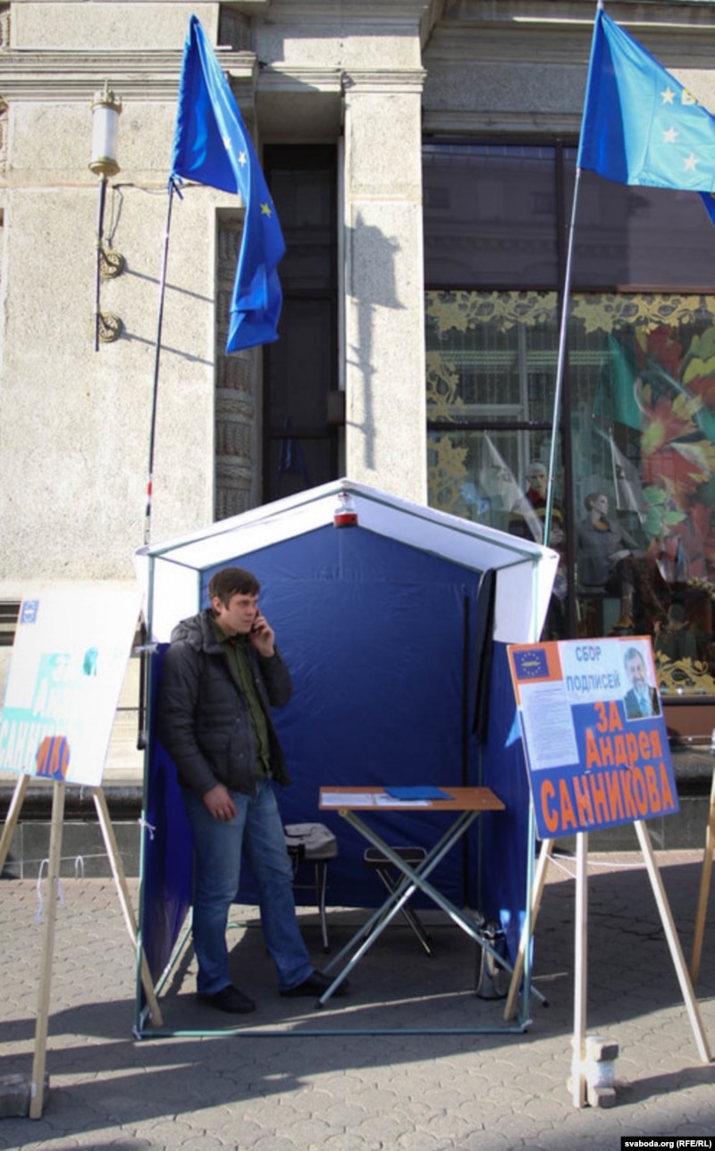 Зьбіральнік подпісаў за Андрэя Саньнікава ў Лідзе, Уладзімер Круцікаў, кажа, што ў іх няма сымболікі, бо на гэта папросту, напэўна, не хапіла сродкаў. Але, зь яго слоў, людзі і так добра падыходзяць да іхніх пікетаў і пакідаюць свае подпісы.