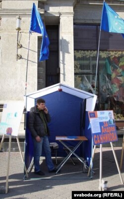 Сіні сьцяг Эўразьвязу вылучае на пляцоўцы каля гарадзкога Дома быту пікет Андрэя Саньнікава. На сьцягу надпіс «Беларусь», аточаны зоркамі. Сэнс сымбалю тлумачыць сябра ініцыятыўнай групы Віктар Болдзін: