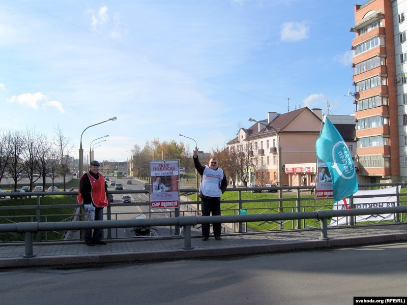 Зьбіральнікі подпісаў за Ўладзімера Някляева сёньня расьцягнулі на мосьце па вуліцы Гарнавых у Горадні расьцяжку зь лягатыпам сваёй кампаніі. Да іх некалькі разоў падыходзілі міліцыянты, патрабавалі, каб тыя сышлі з моста. У іх таксама не было нацыянальнай сымболікі.