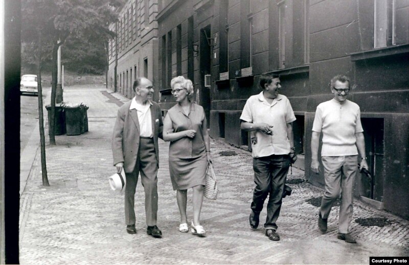 Уладзімер Караткевіч у Празе. Зьлева – Міхась Забэйда-Суміцкі, жонка пісьменьніка Валянціна, справа – Вацлаў Жыдліцкі. 1960-я гады. Фота. С. Панізьніка.