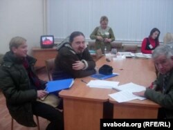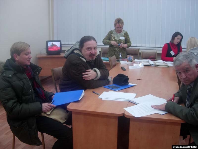 Лявон Вольскі (першы зьлева) і Алег Хаменка (другі зьлева) з гурту "Палац" сустрэліся з кіраўніцтвам выбарчай камісіі.